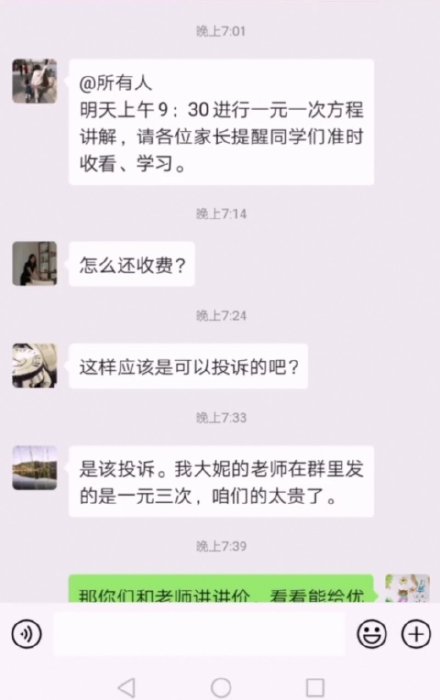 這個(gè)家長(zhǎng)群,最后因?yàn)橐痪湓拸氐紫萑氚察o:“那你們和老師講講價(jià),看看能給優(yōu)惠嗎?”