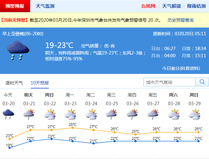 據(jù)深圳氣象臺(tái)預(yù)報(bào),20日有雷陣雨,局部大雨,氣溫19-23℃;21日降雨結(jié)束。21-24日溫暖濕潤(rùn),早晚有輕霧或霧;25-26日有雷陣雨。