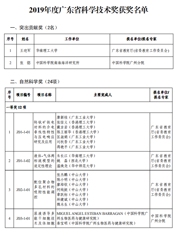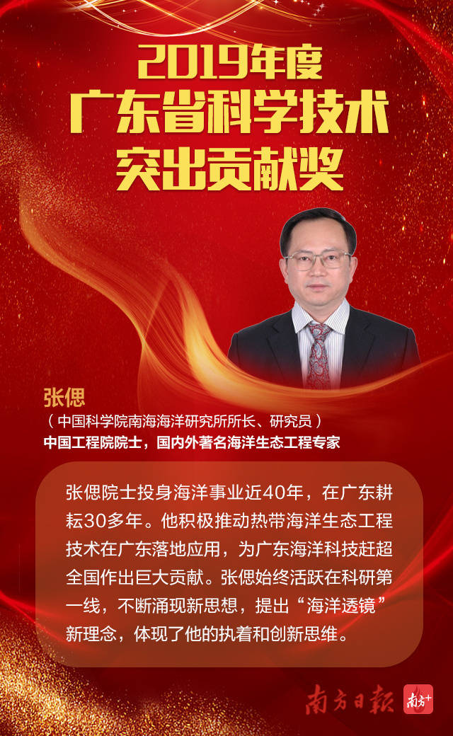 其中,2019年度廣東省科學(xué)技術(shù)突出貢獻(xiàn)獎的獲獎?wù)叻謩e為:中國工程院院士、亞太材料科學(xué)院院士、華南理工大學(xué)教授王迎軍;中國工程院院士,國內(nèi)外著名海洋生態(tài)工程專家,中科院南海海洋研究所所長、研究員張偲。