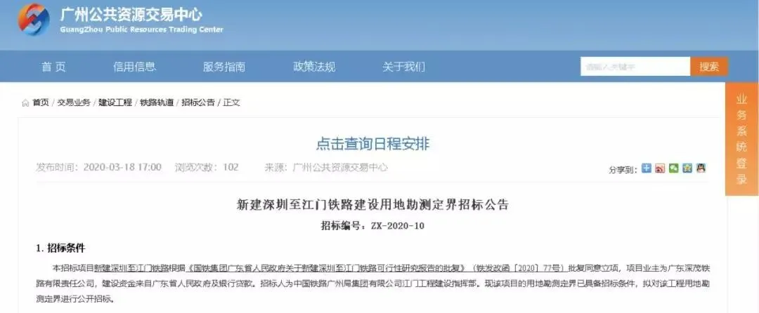 3月18日,《新建深圳至江門鐵路建設(shè)用地勘測定界招標(biāo)公告》在廣州公共資源交易中心網(wǎng)站正式發(fā)布。