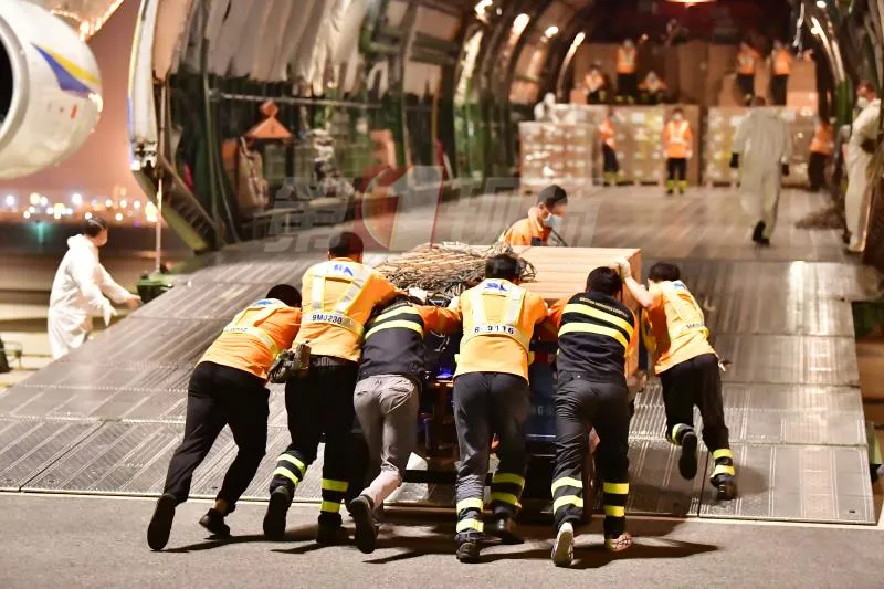 3月23日晚上,在深圳機(jī)場(chǎng)389機(jī)位,機(jī)場(chǎng)人員喊著口號(hào),用力將裝滿物資的貨卡由機(jī)艙口的斜坡推進(jìn)貨艙。經(jīng)過(guò)9個(gè)小時(shí)的忙碌,終于將裝滿110個(gè)貨卡、29塊大貨板的防疫物資全部裝上了這架空中“巨無(wú)霸”,近70噸防疫物資從深圳運(yùn)往捷克首都布拉格。