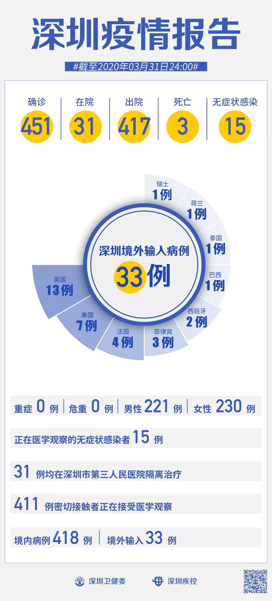 目前,死亡3例,累計出院417例。31例確診病例均在深圳市第三人民醫(yī)院隔離治療。