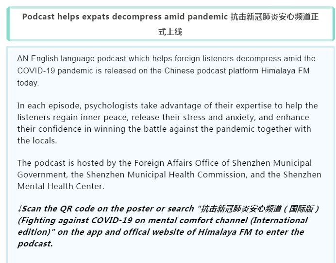 在疫情面前,每一份信念都意義重大,每一個(gè)希望都影響深遠(yuǎn)。4月11日,抗擊新冠肺炎安心頻道(國(guó)際版)在喜馬拉雅 APP正式上線。該欄目在深圳市委組織部的指導(dǎo)下,由深圳市外辦攜手深圳市衛(wèi)健委、深圳市精神衛(wèi)生中心、深圳市國(guó)際交流合作基金會(huì)聯(lián)合出品,由深圳晚報(bào)和深圳喜馬拉雅共同承制。據(jù)悉,抗擊新冠肺炎安心頻道(國(guó)際版)是深圳市外辦首次聯(lián)合多部門(mén)協(xié)作,共同出品的全英文音頻欄目,也是繼"抗擊新型肺炎安心手冊(cè)音頻版"推出以來(lái)的又一大創(chuàng)新。該欄目的推出體現(xiàn)了深圳對(duì)中外居民的人文關(guān)懷,也展現(xiàn)了深圳作為國(guó)際化城市的溫暖大愛(ài)。