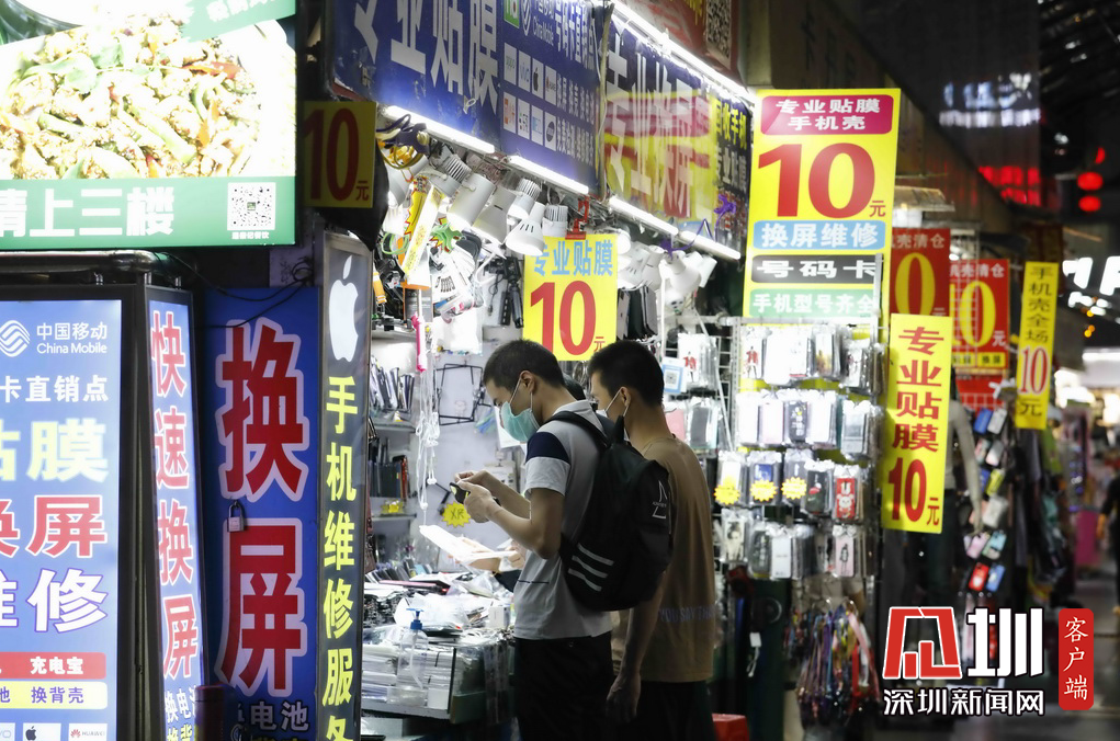 東門步行街的手機(jī)配件門店前,兩位市民正在選購(gòu)。
