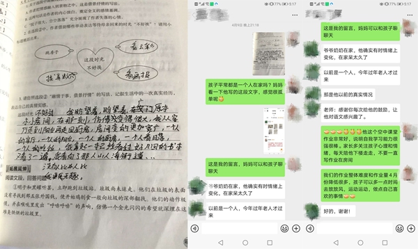 疫情來的迅猛又猝不及防,老師們一方面要完成教學(xué)任務(wù)、引導(dǎo)學(xué)生做好防疫,一方面要時(shí)刻關(guān)注學(xué)生的心理健康。學(xué)生們被迫在家度過了一個(gè)史上最長(zhǎng)的寒假,對(duì)于處在叛逆期的孩子們來說,難免會(huì)與家人出現(xiàn)一些矛盾,在課堂之外,老師們還需要擔(dān)任“心理調(diào)節(jié)師”的角色。一次,周老師班上有個(gè)同學(xué)因?yàn)樯暇W(wǎng)課的事情與父母鬧了矛盾,一氣之下跑到奶奶家,周老師得知了這件事情,第一時(shí)間聯(lián)系上學(xué)生,通過鼓勵(lì)、引導(dǎo),讓學(xué)生認(rèn)識(shí)到自己的錯(cuò)誤,與父母和解。還有一次,周老師通過批改作業(yè),發(fā)現(xiàn)一名學(xué)生在作業(yè)中吐露了自己孤獨(dú)、無趣的心聲??吹胶?,周老師立刻與家長(zhǎng)溝通了解情況,并建議家長(zhǎng)多多陪伴孩子。盡管老師和學(xué)生們不能在學(xué)校的課堂上相聚,但在通訊十分發(fā)達(dá)的現(xiàn)在,老師們也始終用自己的方式陪伴在學(xué)生左右。