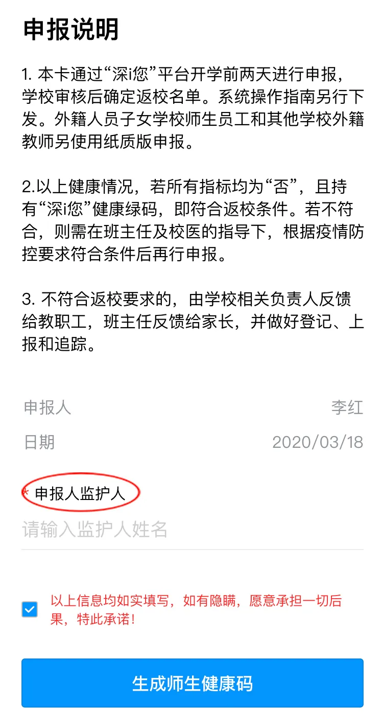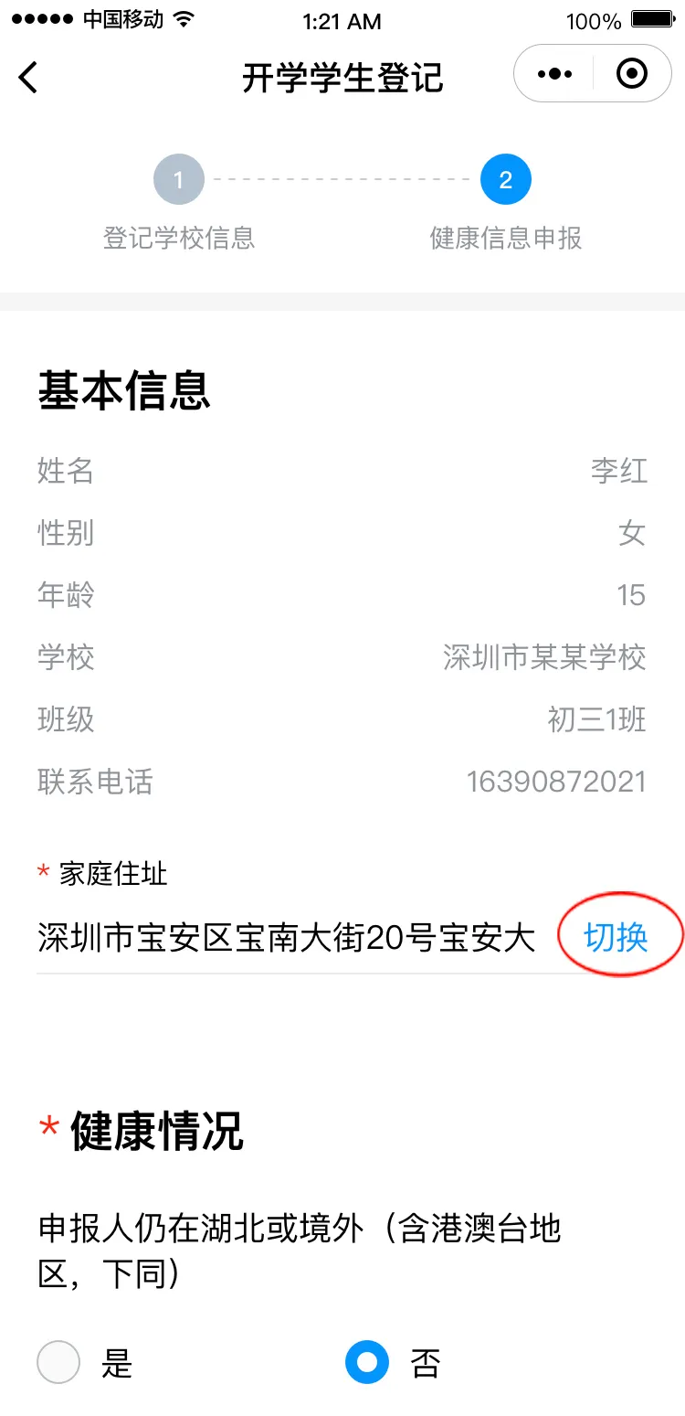請根據(jù)實(shí)際情況完成健康信息申報(bào),包括選擇家庭住址、申報(bào)健康情況、填寫監(jiān)護(hù)人姓名。