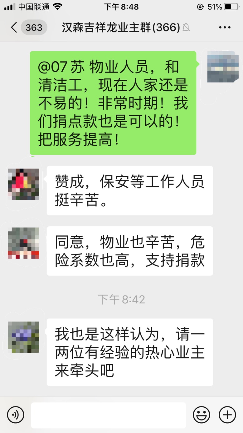 原來,吉祥龍小區(qū)業(yè)主因?yàn)橛X得物業(yè)一線工作人員抗戰(zhàn)疫情工作危險(xiǎn)又更辛苦,便在微信群內(nèi)發(fā)起了給本小區(qū)物業(yè)人員捐款的倡議,收到了眾多業(yè)主的熱烈反響?!百澇桑0驳裙ぷ魅藛T挺辛苦”、“同意,物業(yè)也辛苦,危險(xiǎn)系數(shù)也高,支持捐款”……業(yè)主們通過討論,約定好捐贈(zèng)方式全憑自愿、不搞強(qiáng)制、不論數(shù)額、謹(jǐn)表心意。短短一小時(shí),捐贈(zèng)金額就達(dá)到了3萬余元。業(yè)主余小姐表示,吉祥龍小區(qū)業(yè)主和物業(yè)人員在防疫過程中正團(tuán)結(jié)一心、關(guān)系緊密,一定能保護(hù)好小區(qū)安全。