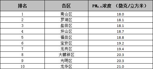 各區(qū)PM2.5平均濃度在18.0-21.0微克/立方米之間,濃度較低的有南山區(qū)、羅湖區(qū)和鹽田區(qū),濃度較高的有龍華區(qū)、光明區(qū)和大鵬新區(qū)。