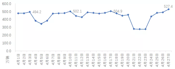早晚高峰車流量逐日增加,高峰持續(xù)時(shí)間更長深圳早晚高峰交通流量以“星期”為單位呈現(xiàn)逐日上升趨勢,2月末全市車流量已恢復(fù)至正常工作日水平。3月末的497.6萬輛/天已超過去年同期的487.8萬輛/天。4月,全市車流量仍然呈上升趨勢,4月27日的車流量已達(dá)527.4萬輛/天。車流量的不斷激增、早晚高峰集中出行,導(dǎo)致高峰持續(xù)時(shí)間較往年更長。