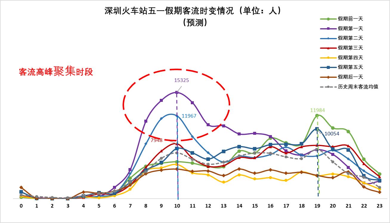 ▲預(yù)計(jì)深圳火車站5月1日(假期第一天)、5月2日(假期第二天)的上午時(shí)段較易出現(xiàn)當(dāng)日客流高峰;4月30日(假期前一天)、5月5日(假期第五天)的晚間時(shí)段較易出現(xiàn)當(dāng)日客流高峰。