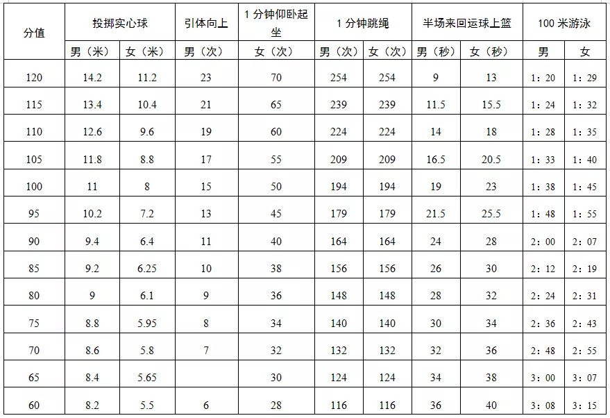 深圳市中考體育項目評分標準
