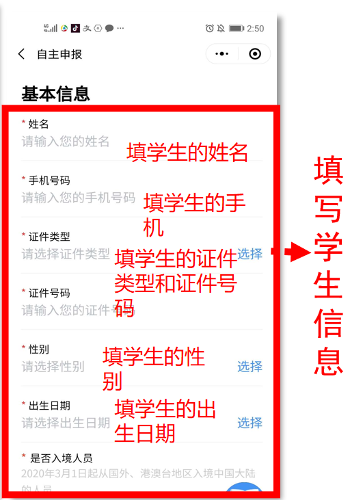②完成后系統提示進行學生登記,進入學生登記后列表,若沒有學生的信息,需要為學生進行自主申報。方式為:點擊首頁自主申報,按照系統提示為學生完成申報。