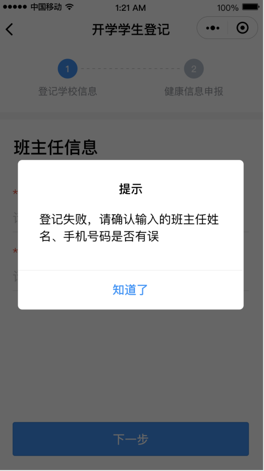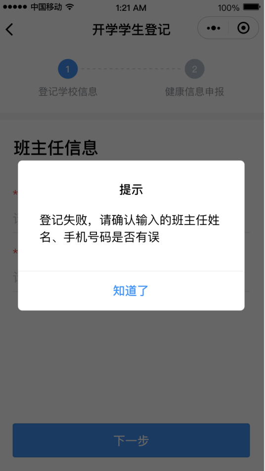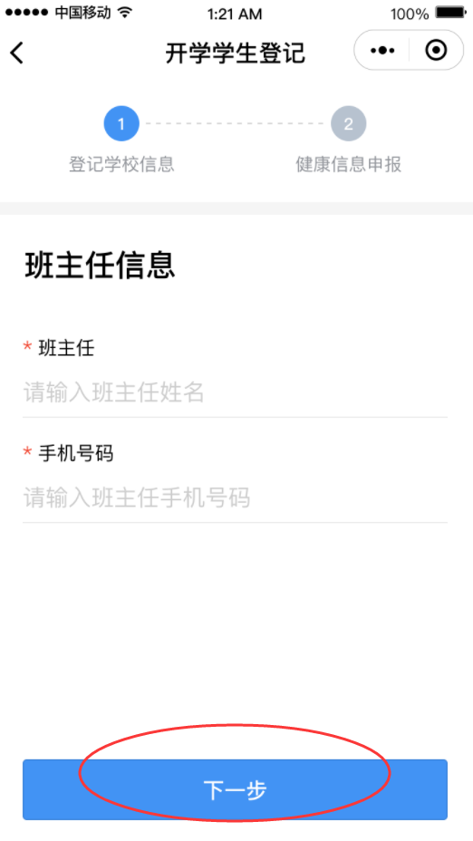 ②進入“學生登記”頁面,點擊“馬上登記”按鈕,填寫班主任姓名和手機號碼后點擊“下一步”,然后選擇對應的班級,進入健康申報卡界面。