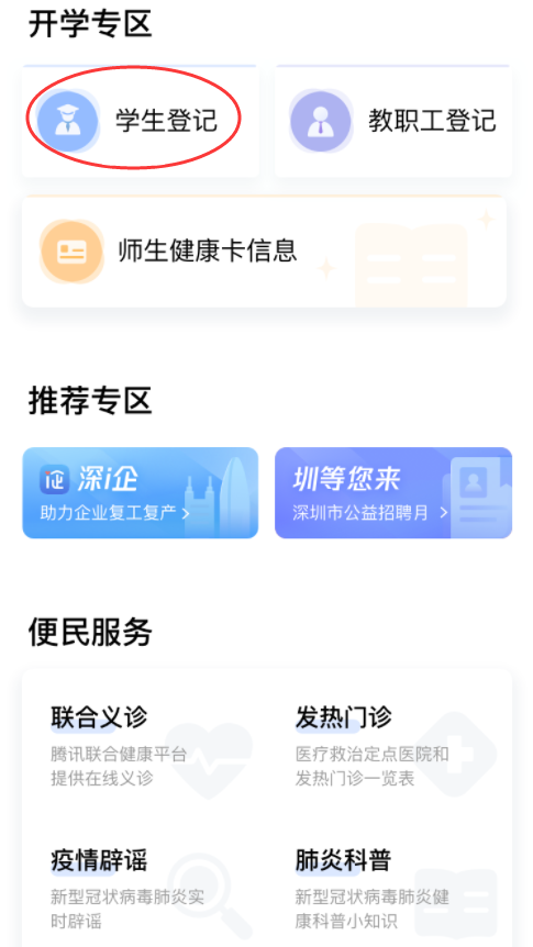 ①在首頁開學專區(qū),點擊“學生登記”進入申報人員列表,進行自主申報和實名認證,再進行開學登記。