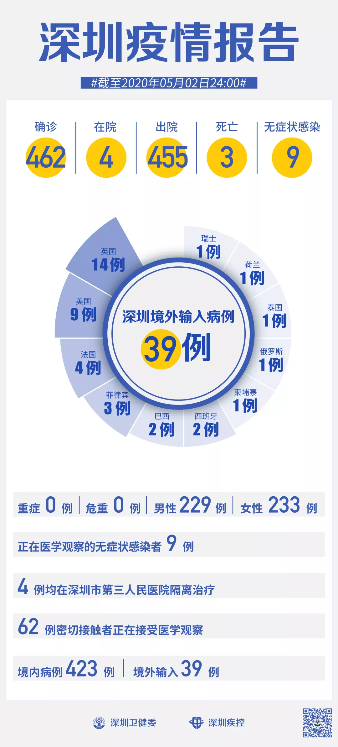 截至5月2日24時,深圳累計報告新冠肺炎病例462例。