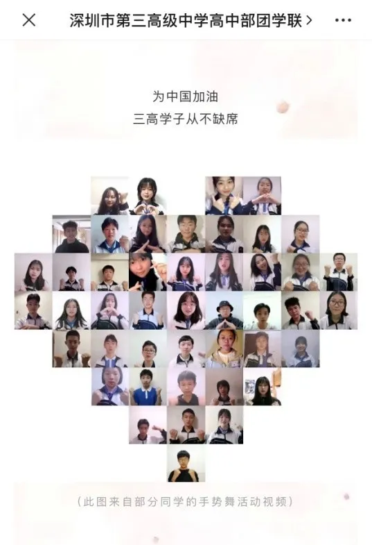 深圳市第三高級中學(xué)團(tuán)委的龐聰老師和同學(xué)們一起錄制了手勢舞《不放棄》,為抗疫一線吶喊加油!活動先由龐聰老師和團(tuán)委學(xué)生聯(lián)合會的同學(xué)們策劃、學(xué)習(xí)、錄制、剪輯、審核,共同制作第一支手勢舞視頻。2月22日,他們在網(wǎng)上發(fā)起手勢舞接力,收到上百名師生發(fā)來的接力視頻,經(jīng)過校團(tuán)委匯總、剪輯、發(fā)布,引起強(qiáng)烈的社會反響。龐老師說:“疫情無情,人間有愛,正是疫情讓我們緊緊地依靠在一起,手勢舞應(yīng)援雖不隆重盛大,但卻也凝結(jié)了我們師生對于疫情重地武漢的鼓勵與支持,對一線醫(yī)療工作者的無私奉獻(xiàn)的感謝。”
