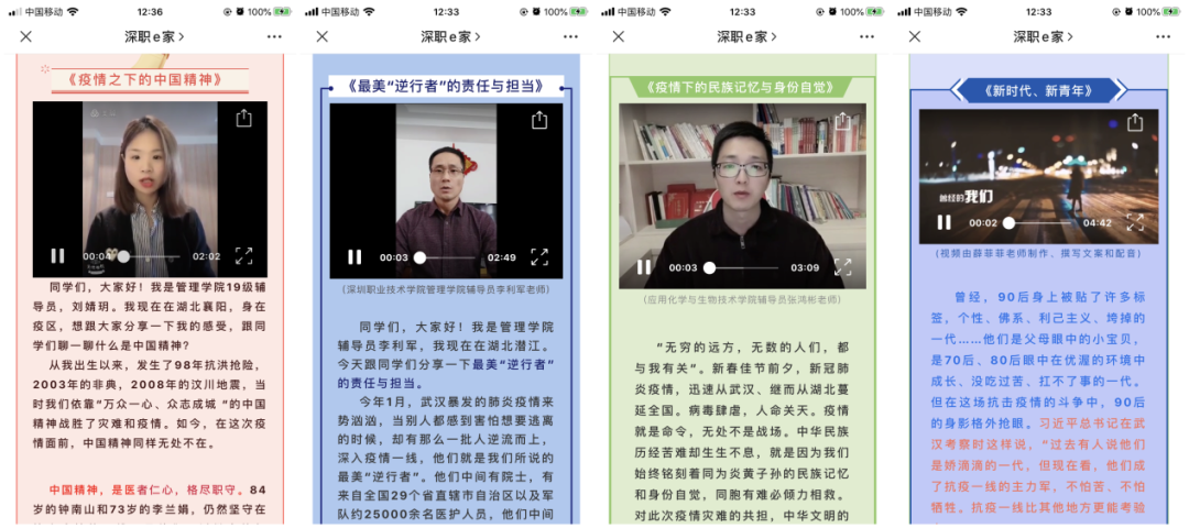 深圳職業(yè)技術(shù)學(xué)院學(xué)生工作部組織33位青年輔導(dǎo)員,推出33講戰(zhàn)“疫情”系列微課程,每天8:30準(zhǔn)時(shí)推送。微課程主題涵蓋愛國主義教育、理想信念教育、生命教育、社會(huì)責(zé)任感教育、感恩教育,不同的主題、不同的視頻、不同的感悟,輔導(dǎo)員老師和同學(xué)們一起在戰(zhàn)“疫”中成長,為同學(xué)們講述每一個(gè)戰(zhàn)“疫”的感人故事。建環(huán)學(xué)院輔導(dǎo)員薛菲菲老師制作精美短視頻、撰寫文案、配樂、配音,以有思想又有溫度的方式與學(xué)生對(duì)話。她說,磨煉是成長的催化劑,抗疫是時(shí)代給予的成人禮,經(jīng)此一役,中國的年輕人們對(duì)責(zé)任和奉獻(xiàn)的感受更加直觀,對(duì)勇敢和擔(dān)當(dāng)?shù)睦斫飧由羁?,而中國,也因?yàn)?0后,收獲了青春洋溢的蓬勃力量!