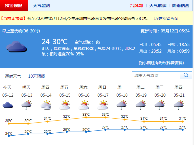 深圳昨夜雷電+大風(fēng)黃色+暴雨黃色預(yù)警齊生效,市氣象臺于2020年05月11日23時30分在全市取消暴雨黃色、大風(fēng)黃色預(yù)警。預(yù)計12日白天多云間陰天,有陣雨。13日陣雨轉(zhuǎn)多云,天況逐漸轉(zhuǎn)好,14-17日多云為主,陽光充足,天氣再趨炎熱。