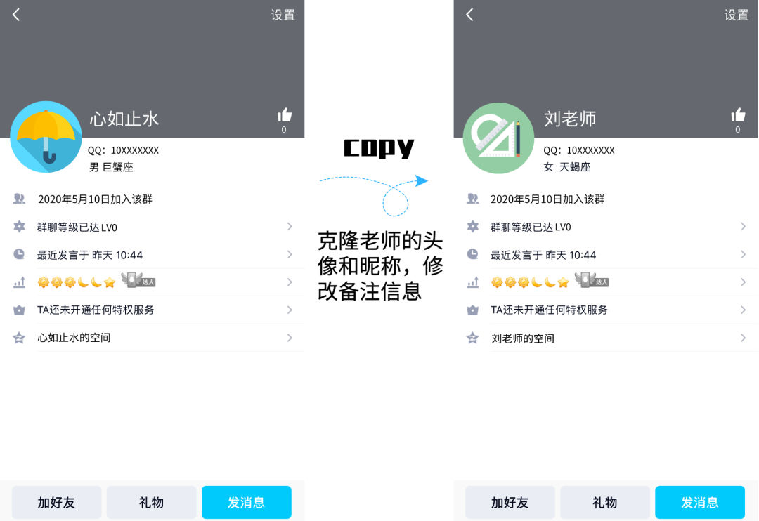1、克隆老師的頭像和昵稱,修改備注信息。