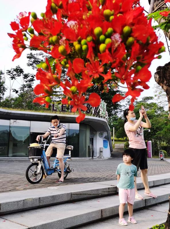 鳳凰木又名火樹、紅花楹,由于其開花時(shí)"葉如飛凰之羽,花若丹鳳之冠",因而得名「鳳凰樹」。每年5月至7月,是鳳凰樹開花的時(shí)節(jié)。在鵬城公園、道路兩旁到處可見鳳凰花盛開,當(dāng)下鳳凰花開正燦爛,錦簇花團(tuán)紅似火,成為鵬城亮麗的風(fēng)景線。圖為龍崗大運(yùn)中心鳳凰樹花開吸引市觀賞拍照。