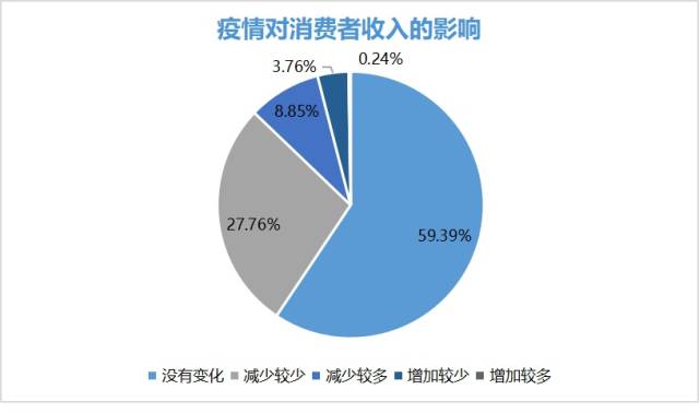 第一,疫情導(dǎo)致部分消費者收入減少。調(diào)研發(fā)現(xiàn),1012位受訪者中收入沒有變化的占比59.39%,受疫情影響收入減少的受訪者占比為36.61%,收入增加的人數(shù)僅4%。