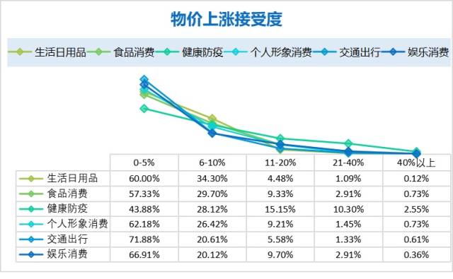 調(diào)研發(fā)現(xiàn),對于生活日用品、食品消費、個人形象消費、交通出行、娛樂消費等各項消費,大部分消費者能接受的價格上漲幅度在5%以內(nèi)。而健康防疫物資方面,43.88%的消費者接受5%以內(nèi)的漲幅,28.12%的消費者接受6-10%的漲幅,15.15%的消費者接受11-20%的漲幅,即消費者能接受防疫物資價格較大幅度的上漲。