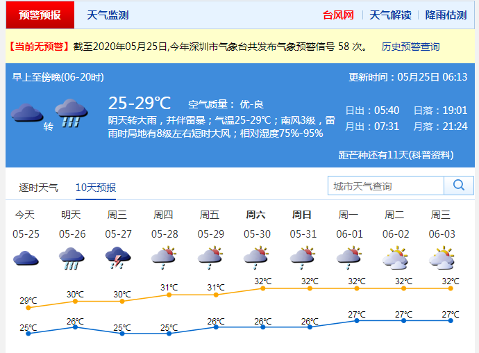 見(jiàn)圳客戶端·深圳新聞網(wǎng)2020年5月25日訊 連續(xù)陰雨雷暴,上周末的天氣趨于平靜,但是,新一波“龍舟水”馬上到貨!據(jù)深圳氣象臺(tái)消息,25-26日深圳有大雨到暴雨,并伴有雷暴和8級(jí)左右短時(shí)大風(fēng),降雨主要出現(xiàn)在25日中午至26日上午,26日午后降雨減弱;27-30日仍有陣雨或雷陣雨。