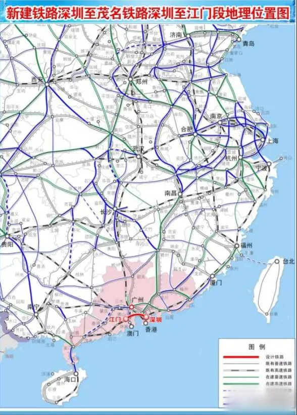 新建鐵路深圳至茂名鐵路深圳至江門段正線從深圳樞紐西麗站(規(guī)劃)引出,經(jīng)深圳市、東莞、南沙區(qū),中山、江門,引入深茂鐵路江門至茂名段江門站(在建)。