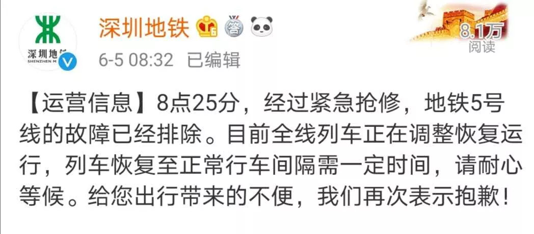 深圳地鐵5號線今早突發(fā)故障!目前已恢復正常運行