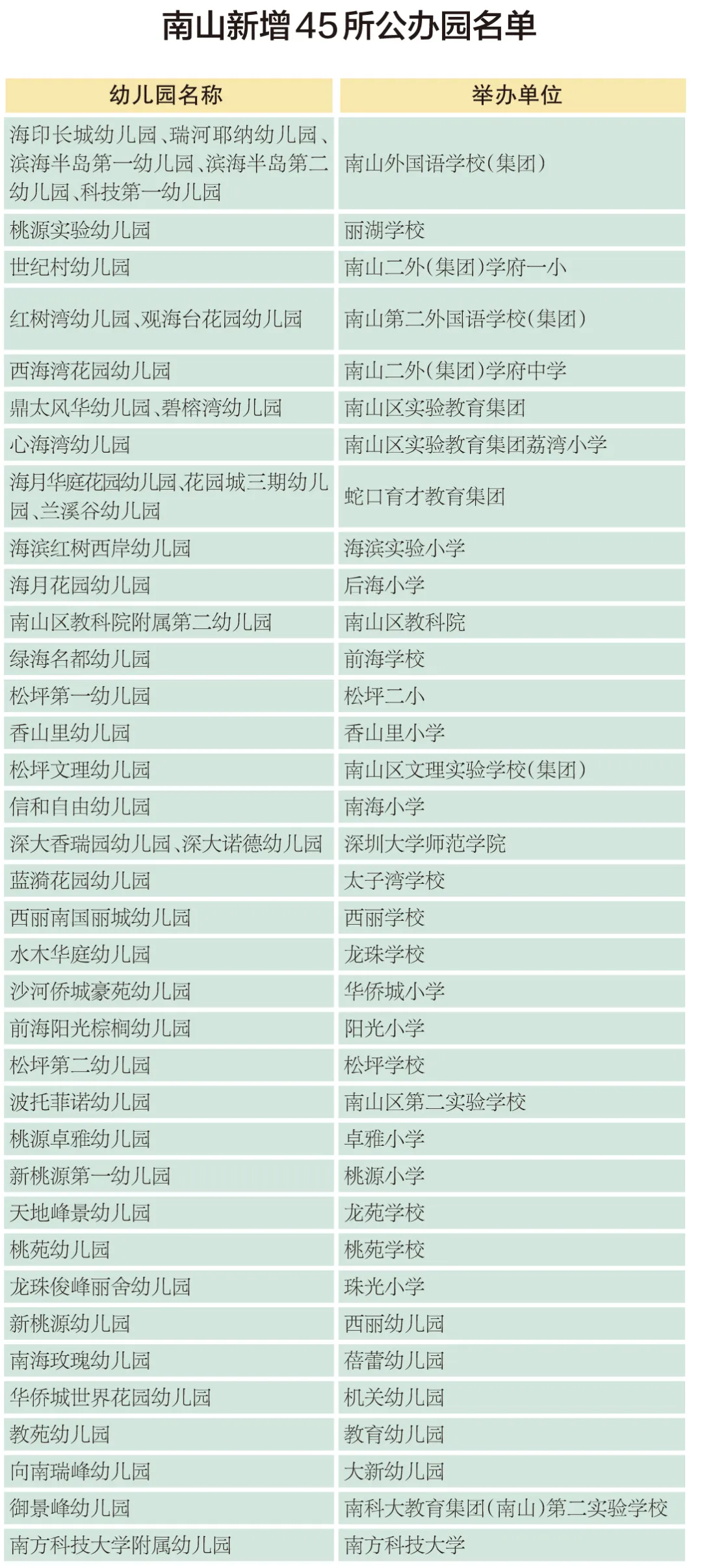另外2所為新建幼兒園分別是由育才教育集團舉辦的蘭溪谷幼兒園、由南方科技大學教育集團舉辦的御景峰幼兒園,將于今年9月開學。還有41家民辦幼兒園均為政府產(chǎn)權(quán)到期移交,轉(zhuǎn)公辦園后,交由南山區(qū)各教育集團、學校和已有公辦園舉辦。