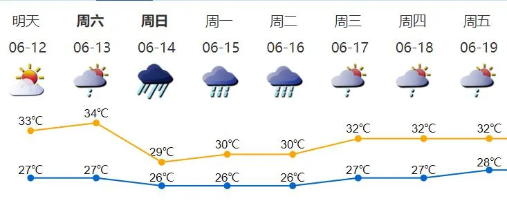 12-13日多云,偶有短時(shí)(雷)陣雨,天氣炎熱;14-15日有一次明顯風(fēng)雨過(guò)程;16日仍有明顯降雨;17-18日多云,有陣雨或雷陣雨。