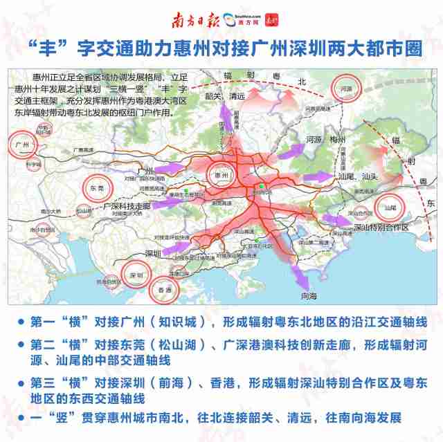 陳鴻宇舉例說,介于廣深兩大都市圈之間的惠州,大手筆規(guī)劃“豐”字交通主框架,向西分別對(duì)接廣州、東莞、深圳,向東輻射河源、汕尾等地,向北則連接韶關(guān)、清遠(yuǎn)。類似這樣,各城市可緊密對(duì)接,推進(jìn)更多跨城市、跨都市圈的合作。