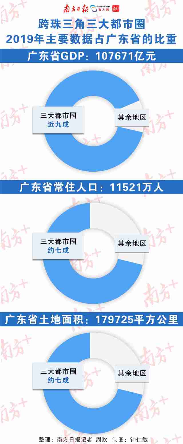 南方城市智庫梳理發(fā)現(xiàn),去年廣州、深圳、珠江口西岸三大都市圈的經(jīng)濟(jì)總量超過9萬億元,占全省近九成;常住人口、土地面積均占全省約七成。