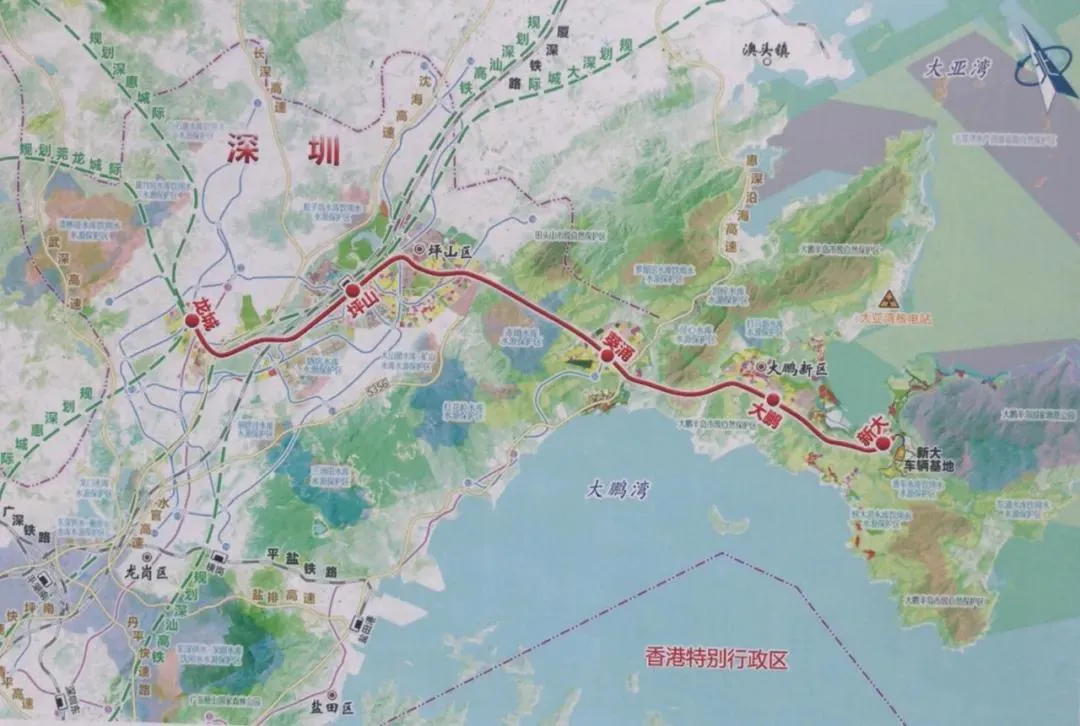 龍崗至大鵬支線:起自龍崗,經坪山至大鵬新區(qū),線路與深惠城際、深大城際銜接。