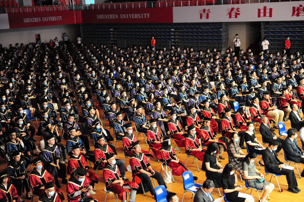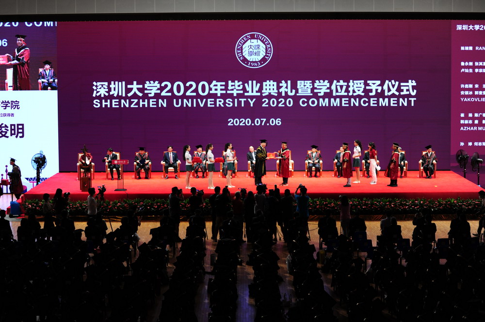 上午9時,畢業(yè)典禮在莊嚴的國歌聲中拉開了帷幕。據(jù)介紹,2020年深圳大學畢業(yè)研究生數(shù)量創(chuàng)歷史新高,達到2334名,包括44位博士學位獲得者,2290位碩士學位獲得者。其中,郭奎奎等20人獲得廣東省優(yōu)秀學生稱號,李豪道等140人榮獲國家獎學金,曾吉申等64人榮獲鵬城獎學金、騰訊創(chuàng)新獎學金。