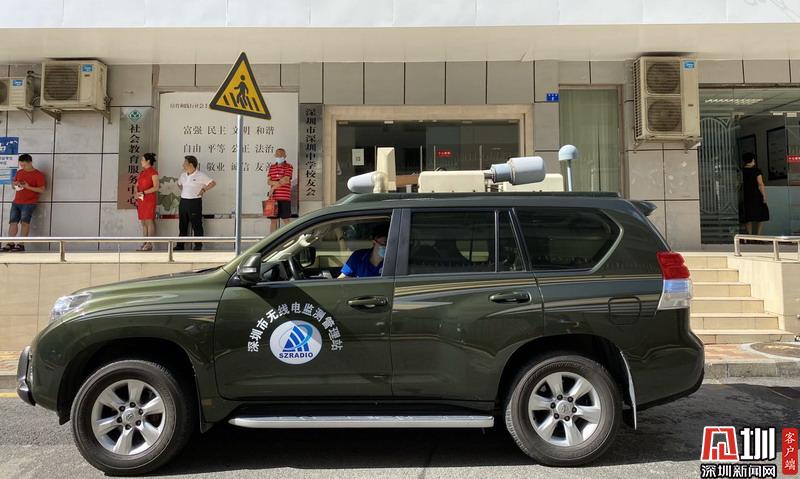 深圳中學(xué)考點外無線電監(jiān)測管理站工作車輛在現(xiàn)場進行保障任務(wù)。