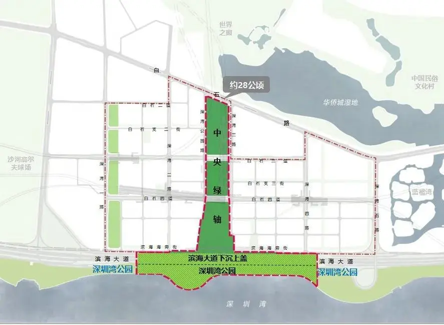 今年6月6日上午,該基地舉行中央綠軸項目開工活動,此次開工的中央綠軸項目南北全長約1.0公里,最大寬度達210米,是連接塘朗山——華僑城濕地——深圳灣“通山達?!钡暮诵目臻g軸線。隨著濱海大道深超總段下沉工程建設,未來深超總紅線內(nèi)景觀將與深圳灣公園無縫銜接,共同構(gòu)成南北貫通的中央綠軸體系。