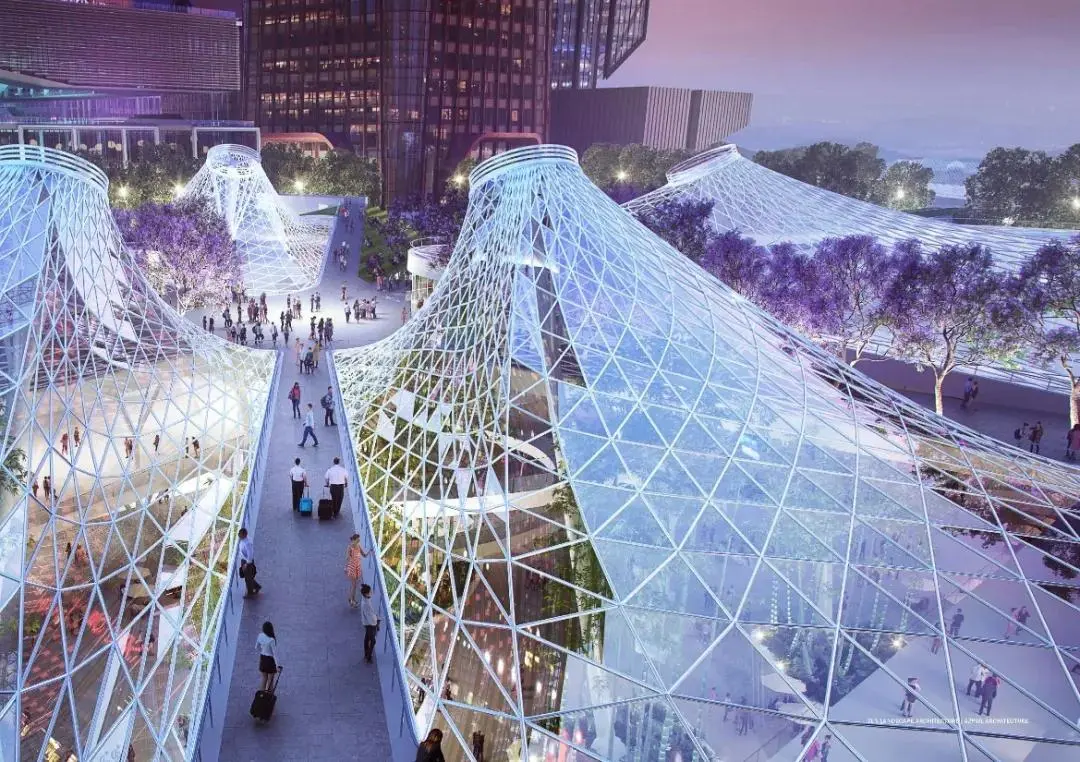 為車站廣場(chǎng),“水晶山丘”屋面覆蓋著地下車站樞紐大廳,同時(shí)也在地面創(chuàng)造出造型獨(dú)特的城市地標(biāo)。光影和夜景效果與交叉的藍(lán)花楹大道配合,打造一個(gè)極具設(shè)計(jì)感的交通集散空間。地下共享大廳、地下森林與地面廣場(chǎng)、周邊建筑建立視覺聯(lián)系,成為中央綠軸美景的一部分。