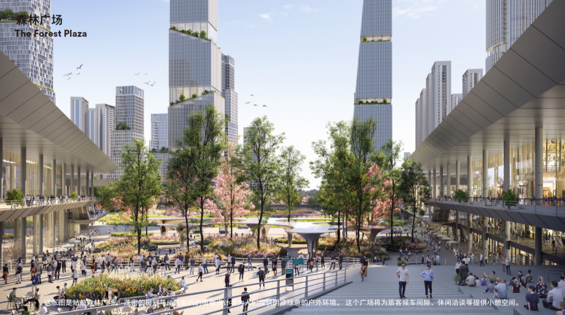 方案以獨(dú)特的“綠鏈都芯”為理念,打造一個耦合生態(tài)、交通和公共生活的超級樞紐。設(shè)計的中央綠芯引入大面積森林和草甸,使人們在城市中重遇自然,讓北站樞紐地區(qū)既擁有大城市商務(wù)中心區(qū)的特質(zhì),也擁有郊外自然的品質(zhì),形成全新的都市生活體驗。同時,中央綠芯還包括會議論壇、多功能演藝中心等一系列公共服務(wù)設(shè)施,提供面向未來的文化知識交流服務(wù)。