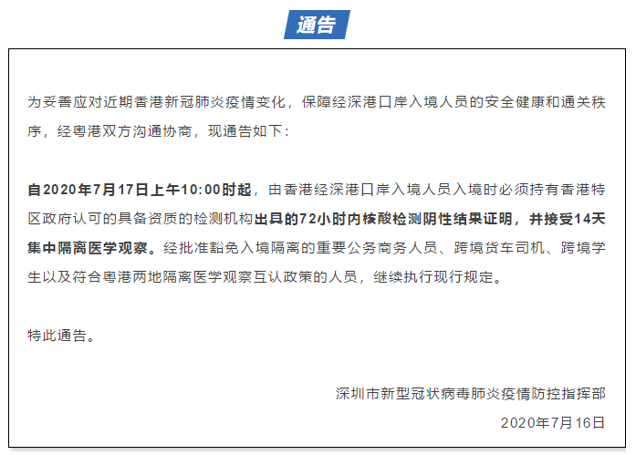 1、7月16日晚間,深圳市新型冠狀病毒肺炎疫情防控指揮部調(diào)整由香港經(jīng)深港口岸入境人員防控措施,由香港口岸入境人員須持72小時(shí)內(nèi)核酸檢測(cè)陰性結(jié)果證明,并接受14天集中隔離醫(yī)學(xué)觀察。