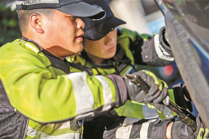 時(shí)云財(cái)和同事馬上幫助陳先生從車(chē)后備箱拿出換胎工具和備胎,在保證安全的前提下,僅用10分鐘就更換好輪胎。“太感謝你們了,深圳交警‘小黃人’真的是我們最信任的人,有你們?cè)谖矣X(jué)得上路開(kāi)車(chē)就很放心。”陳先生不住地感謝、稱(chēng)贊交警鐵騎小哥。