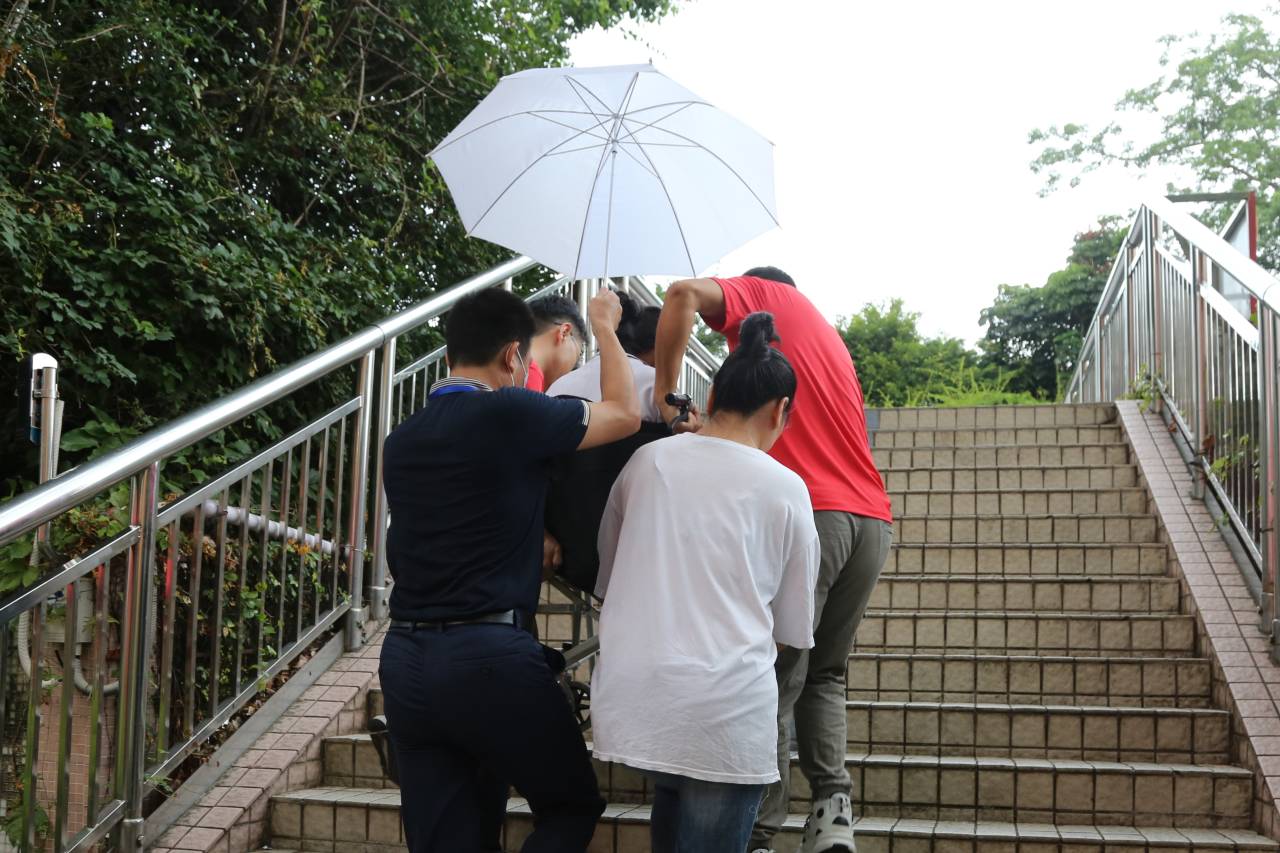 東升學(xué)??键c(diǎn)有一位行動(dòng)不便的考生,學(xué)校派三名工作人員提前護(hù)送考生到考場(chǎng)。 (記者李麗、周紅聲)