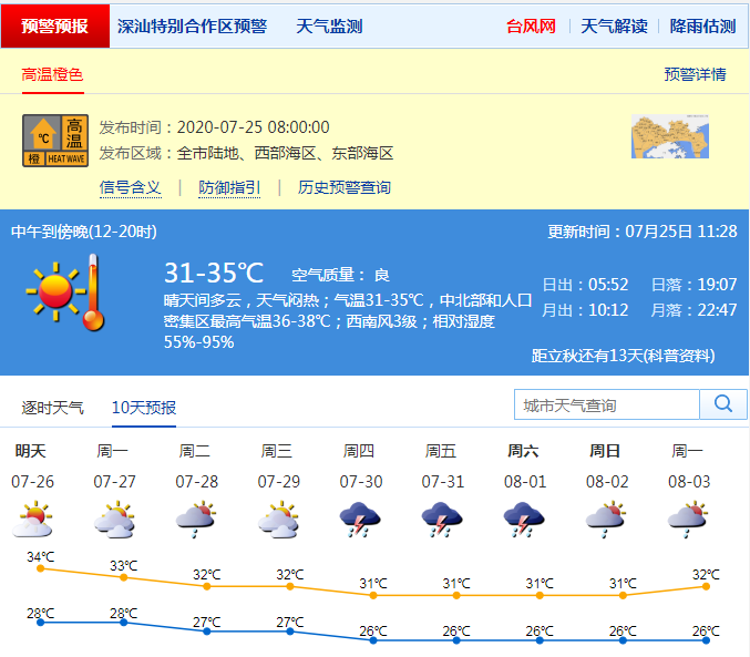 深圳市氣象局預(yù)計今明兩日深圳(含深汕)高溫天氣持續(xù),最高氣溫可達34-36℃;27-31日轉(zhuǎn)雷雨天氣,高溫天氣略有緩解,其中27-28日多云,有短時(雷)陣雨;29-31日有雷陣雨。
