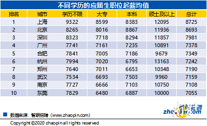 上海、北京、深圳、廣州這些一線城市的應(yīng)屆生平均起薪相對較高。一般而言,在各城市中,隨著學(xué)歷的提高,應(yīng)屆生起薪也會相應(yīng)增加。但由于職業(yè)或行業(yè)的人才缺口較大,使得某些職位盡管學(xué)歷不限或僅要求大專學(xué)歷,但其薪酬卻相對較高。例如,上海有的職位學(xué)歷不限或要求大專以上,但起薪要高于本科崗位,這也間接反映出應(yīng)屆生就業(yè)市場存在明顯的結(jié)構(gòu)矛盾。