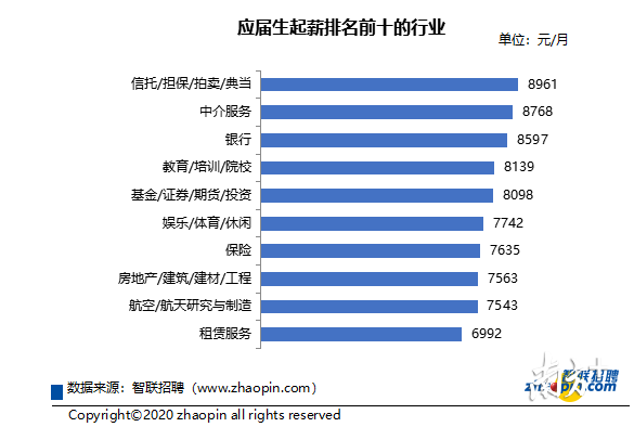 報(bào)告顯示,應(yīng)屆生起薪排名前十的行業(yè)中,信托/擔(dān)保/拍賣/典當(dāng)、中介服務(wù)、銀行等行業(yè)為起薪排名前三名,分別為8961元,8768元和8597元。除此之外,教育/培訓(xùn)/院校、娛樂/體育/休閑等受益于直播經(jīng)濟(jì)的帶動(dòng)和數(shù)字化的發(fā)展,也向應(yīng)屆生開出了相對高的薪酬。