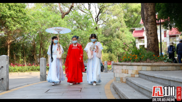 風(fēng)景如畫的東湖公園吸引來(lái)了不少漢服愛(ài)好者,她們身著霓裳羽衣,手撐紙傘,步履輕盈,五彩繽紛的服飾與滿園的春色相映生輝,一幅春天最美的畫卷就這樣在眼前展開(kāi)。穿漢服的小姐姐們告訴記者,她們是專程從龍華過(guò)來(lái)的,因?yàn)楹芟矚g漢服又正值踏青賞花好風(fēng)光,特地與好友來(lái)東湖公園一起記錄春天的精彩瞬間。