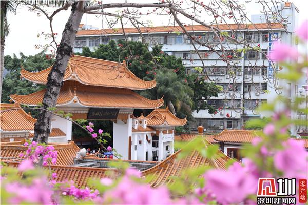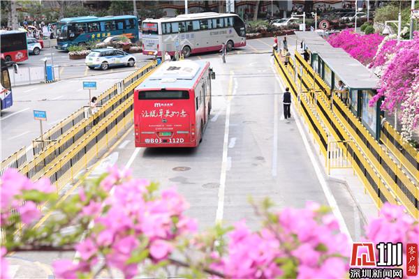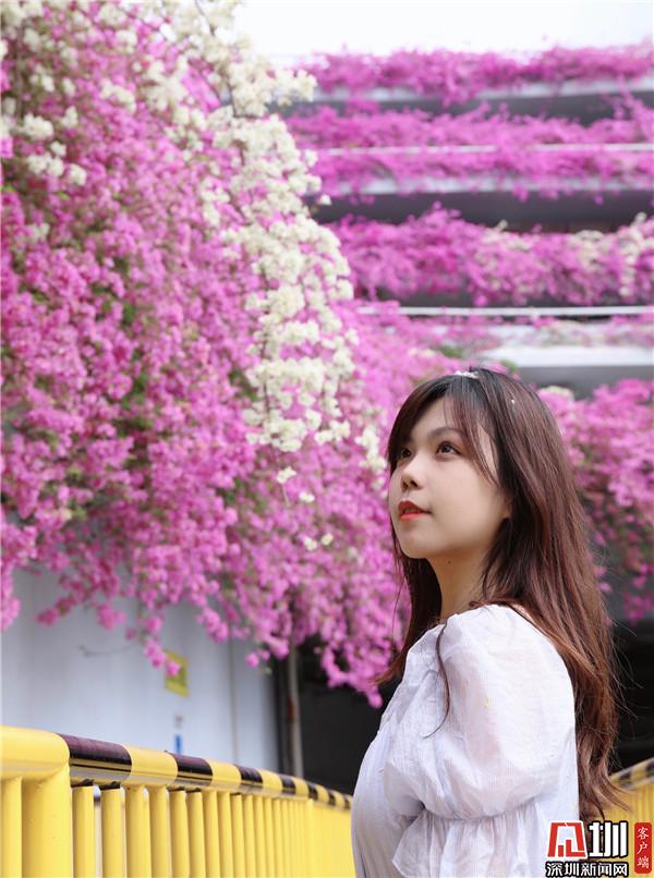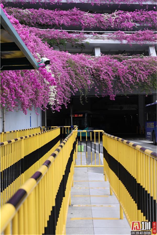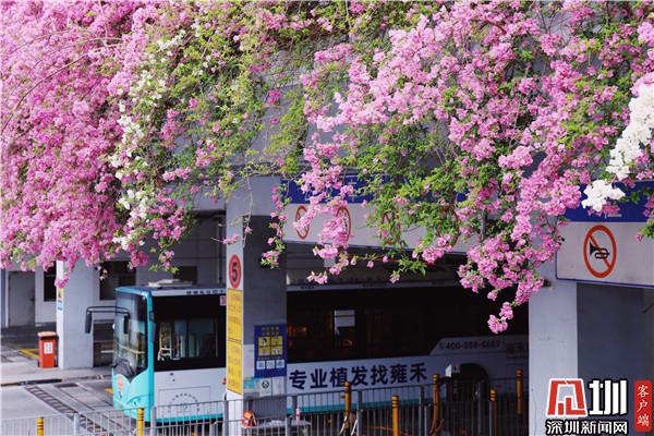 三月末,春深處,粉紫色的花朵環(huán)繞著停車場肆意綻放,與深圳藍相映成趣。