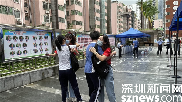 老師在考場入口為考生送上暖心擁抱,希望大家都能超常發(fā)揮,考出好成績。