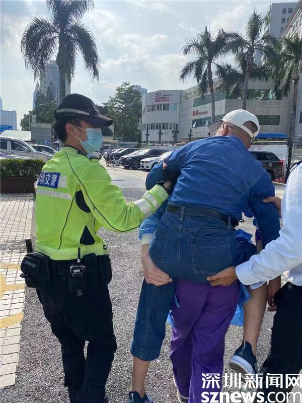 緊接著,警力隊員、公交車司機、醫(yī)護人員接力背起老人護送至醫(yī)院,路上的熱心市民也自覺地讓出了一條生命通道。