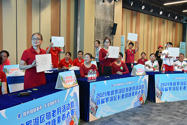 讀特客戶端·深圳新聞網(wǎng)2021年11月19日訊(記者 邱婕 通訊員 涂亮亮)11月19日下午,首屆羅湖區(qū)長者健康素養(yǎng)大賽在翠竹街道金展珠寶廣場舉行。本次活動(dòng)是由羅湖區(qū)衛(wèi)生健康局、羅湖區(qū)翠竹街道辦事處主辦,羅湖區(qū)老年人協(xié)會(huì)、羅湖區(qū)老年人體育協(xié)會(huì)、羅湖區(qū)離退休女干部聯(lián)誼會(huì)、羅湖區(qū)各街道老年人協(xié)會(huì)等單位承辦的2021羅湖區(qū)敬老月系列活動(dòng)之一,深圳市衛(wèi)生健康委老齡健康處二級(jí)調(diào)研員許月琴、羅湖區(qū)衛(wèi)生健康局二級(jí)調(diào)研員劉嶺、羅湖區(qū)疾控中心主任陳偉紅和翠竹街道辦事處四級(jí)調(diào)研員黃錦方參加了本次活動(dòng)。